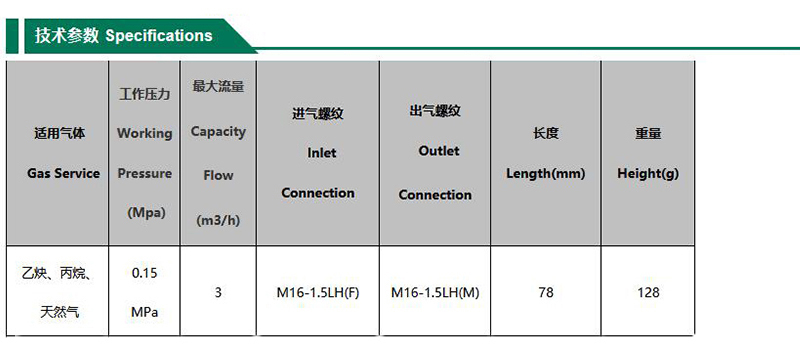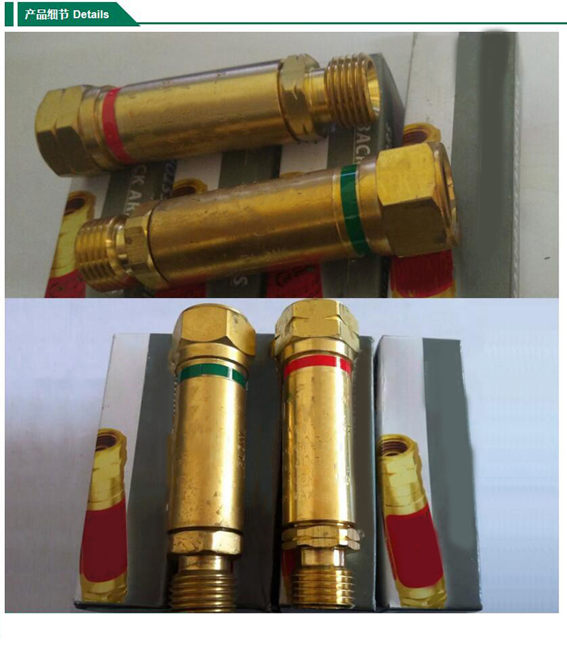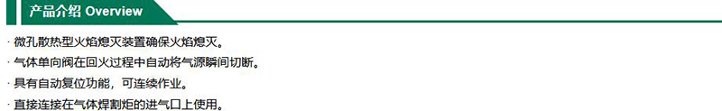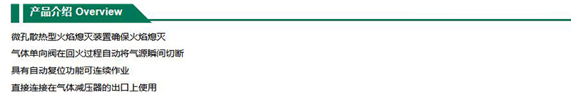 ·微孔散热型火焰熄灭装置确保火焰熄灭 ·气体单向阀在回火过程自动将气源瞬间切断 ·具有自动复位功能可连续作业 ·直接连接在气体减压器的出口上使用