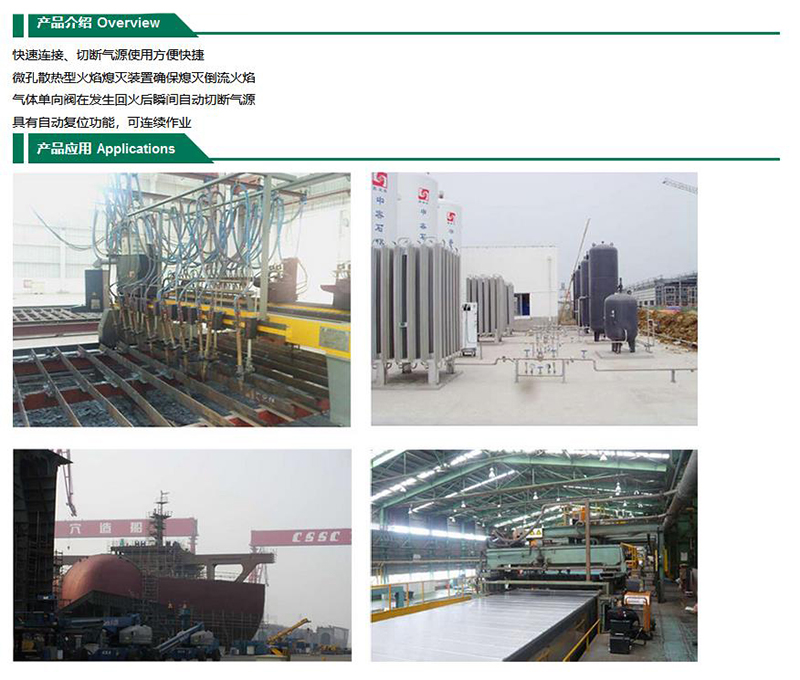 ·快速连接、切断气源使用方便快捷 ·微孔散热型火焰熄灭装置确保熄灭倒流火焰 ·气体单向阀在发生回火后瞬间自动切断气源 ·具有自动复位功能,可连续作业