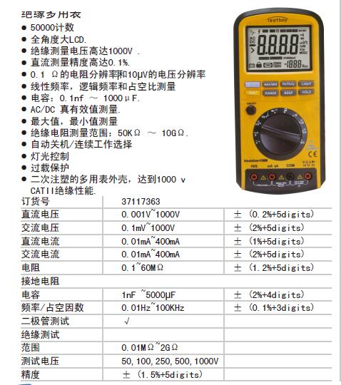 ·50000计数 ·全角度大LCD. ·绝缘测量电压高达1000V . ·直流测量精度高达0.1%. ·0.1 Ω的电阻分辨率和10μV的电压分辨率 ·线性频率,逻辑频率和占空比测量 ·电容:0.1nf ~ 1000μF. ·AC/DC 真有效值测量. ·最大值,最小值测量 ·绝缘电阻测量范围:50KΩ ~ 10GΩ. ·自动关机/连续工作选择 ·灯光控制 ·过载保护 ·二次注塑的多用表外壳,达到1000 v CATII绝缘性能.