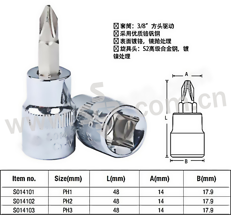 ·套筒:1/2"方头驱动,采用优质铬钒钢,表面镀铬,镜面抛光处理。
