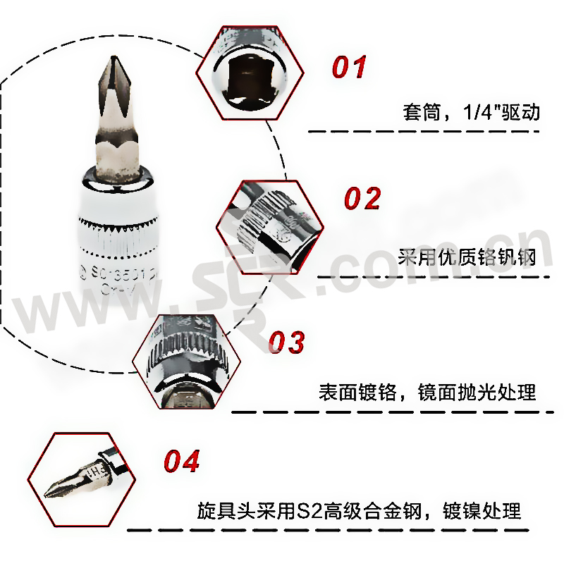 ·套筒:1/2"方头驱动,采用优质铬钒钢,表面镀铬,镜面抛光处理。