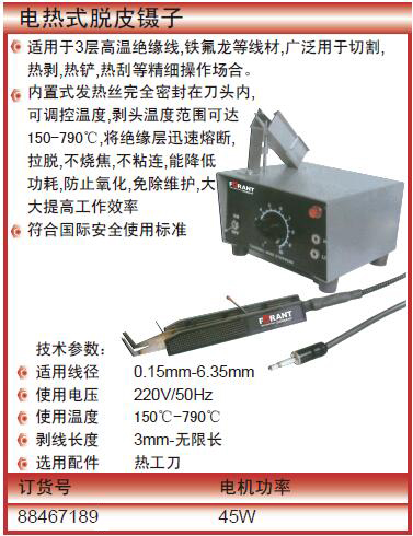 ·内置式发热丝完全密封在刀头内, ·可调控温度,剥头温度范围可达150-790℃,将绝缘层迅速熔断, ·拉脱,不烧焦,不粘连,能降低功耗,防止氧化,免除维护,大大提高工作效率 ·符合国际安全使用标准