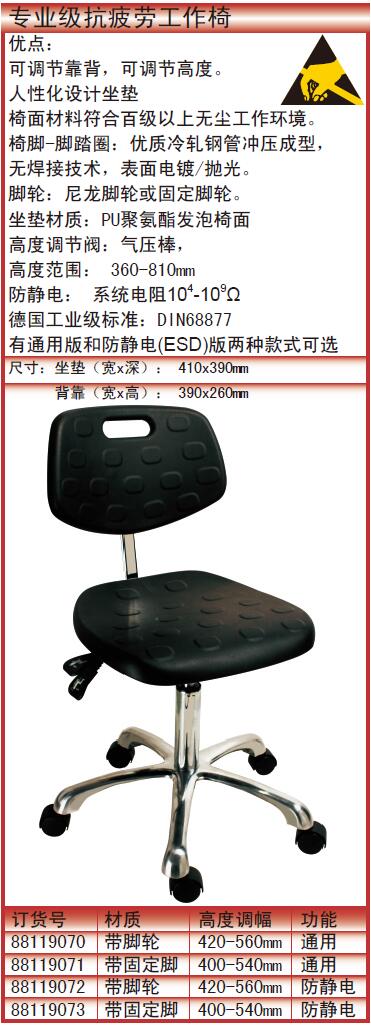 ·优点:可调节靠背,可调节高度。 ·人性化设计坐垫 ·椅面材料符合百级以上无尘工作环境。 ·椅脚-脚踏圈:优质冷轧钢管冲压成型,无焊接技术,表面电镀/抛光。 ·脚轮:尼龙脚轮或固定脚轮。 ·坐垫材质:PU聚氨酯发泡椅面高度调节阀:气压棒, ·高度范围:360-810mm ·防静电:系统电阻104-109Ω ·德国工业级标准:DIN68877 ·有通用版和防静电(ESD)版两种款式可选 ·尺寸:坐垫(宽×深):410×390mm ·背靠(宽×高):390×260mm