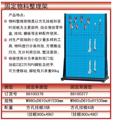 ·物料整理架物是以方孔挂板和百 叶挂板为主要部件,结合背挂零件 盒,挂钩,棚板等多种配件使用。 ·对生产现场的小型少量多样的工 具,物料进行分类存放,方便搬运 归为,充分利用空间,整洁高效。 ·根据使用分为单面和双门型, 加装2定2万向PU脚轮及把手, 可方便移动,脚轮每只承重90kg