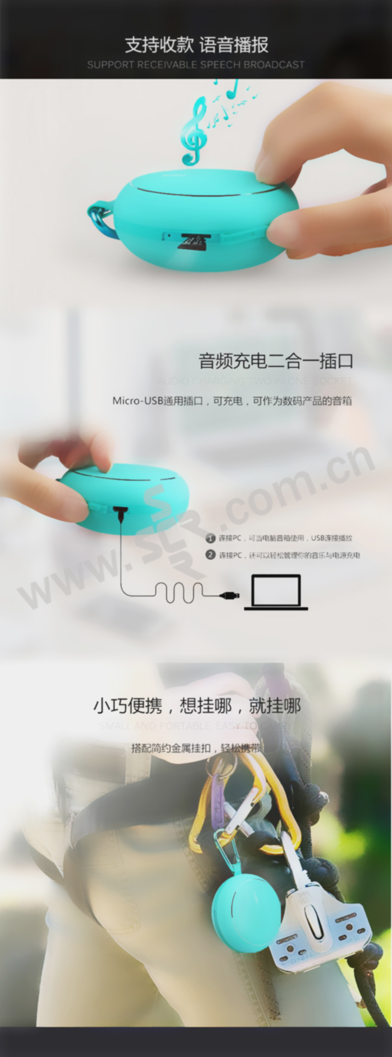 ·外观小巧、易携带,多种时尚色彩,支持与手机蓝牙无线连接,播放音乐、电影、游戏,让你的生活无限时尚,无线方便。