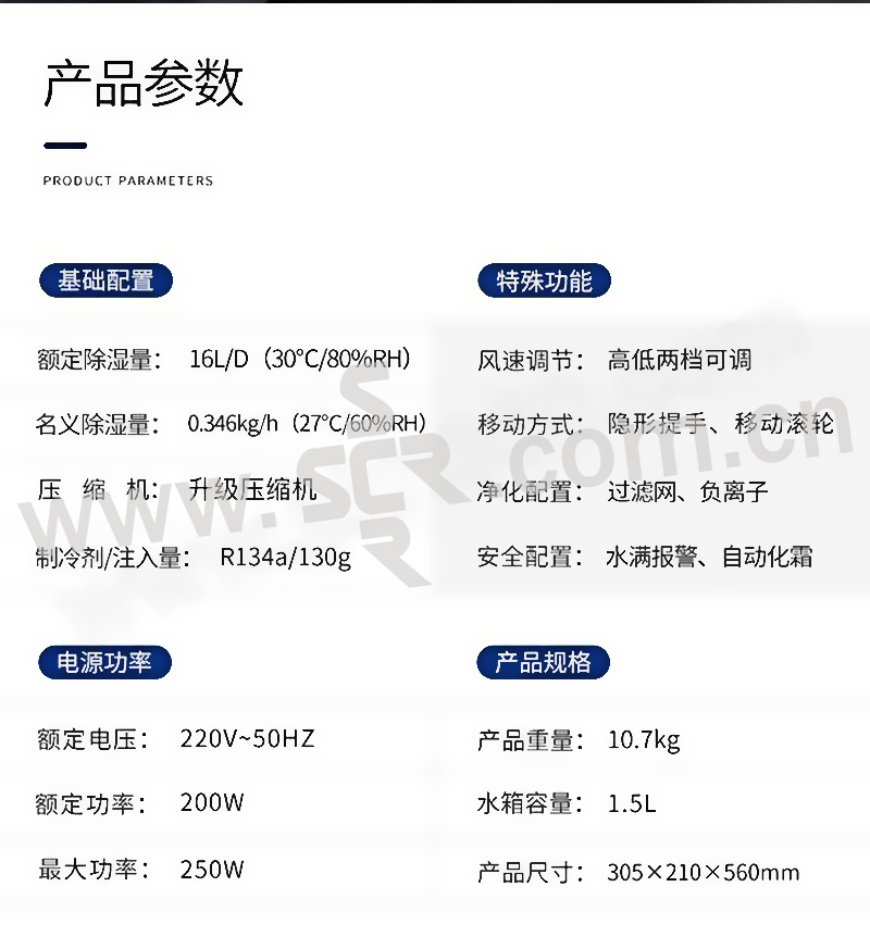 EURGEEN/欧井 16L家用抽湿机 OJ-161E 除湿量16L/d 5~35m2 352×243×560mm 自重13kg 1台